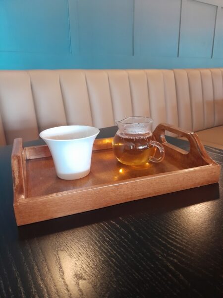 Inside, you’ll find sleek seating options: from bar tops and booths to velvety sofas, and even a reservable space for meetings or small groups. Their menu extends far beyond espresso, with plenty of non-coffee options and a great tea lineup (served in adorable 12-oz teapots).